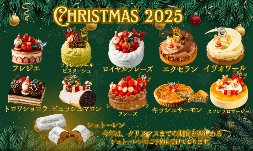 今年のクリスマスは10種類のケーキと、クリスマスまでの期間を楽しめるシュトーレンをご用意いたしました。